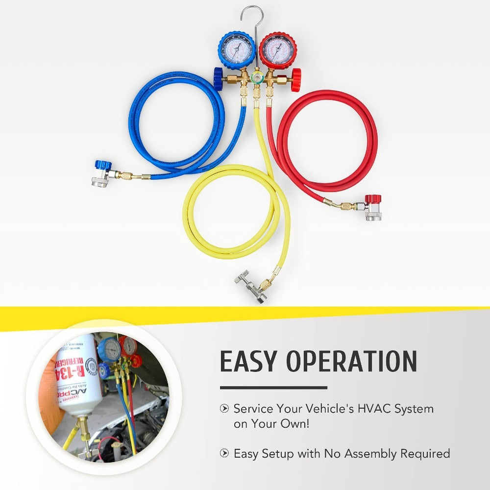 - WIDE APPLICATION: This car AC gauge set works with R134a, R12, R22, and R502 refrigerants; ideal for both DIY and professional HVAC maintenance, it allows you to measure your system’s pressure, evacuate and refill coolant, and more; a heavy-duty blow-molded carrying case comes included for easy storage and transport between jobs